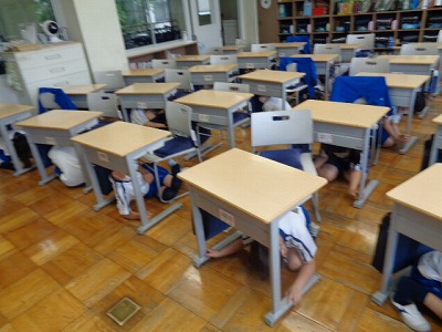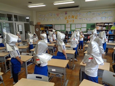 机の下に身を隠すことはもちろんのこと、先生たちの指示を最後まで聞くことや、避難時は横を揃えて2列で避難すること、「お・は・し・も・て」を守ることなど、子どもたちに問いかけながら確認しています。