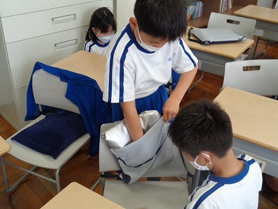 それから、防災座布団の出し入れやかぶり方もおさらいし、落ち着いて安全に避難することも全体で共有できました。