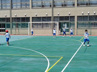 多くの子どもたちが、グラウンドで鬼ごっこをしていました。