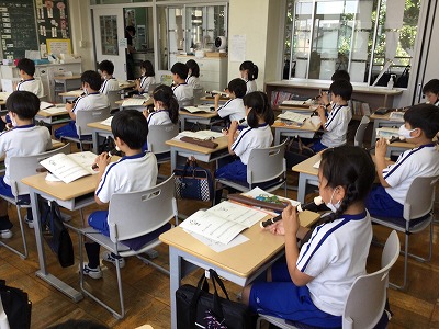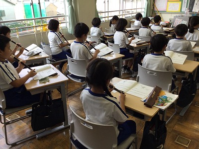 前の時間に鑑賞した「ホルディリア」の裏声と地の声の使い分けを意識して歌っている友達がいます。みんなの声がそろい、「ホラヒヤッホ~♪」が気持ちよく響いていました。さて、今日から、リコーダーテキスト『笛星人』を貸し出ししました。