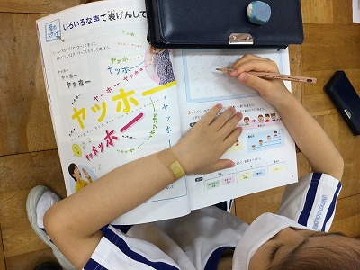 びっくりしたときの「ヤッッホホッ」や、お母さんが喜んで「ヤッホーーー」など、教科書に思い思いのヤッホーを書き込みます。