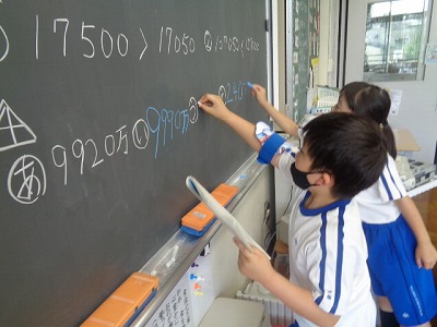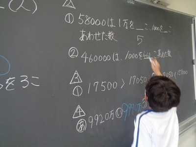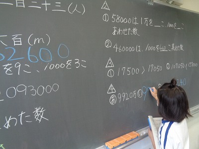 これまで学習してきた漢数字を数字に、数字を漢数字に変換する問題や数直線の問題、10倍した数、100倍した数、10で割った数を表す問題など、みっちりと取り組む時間になりました。