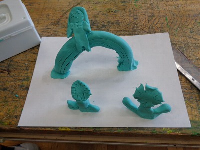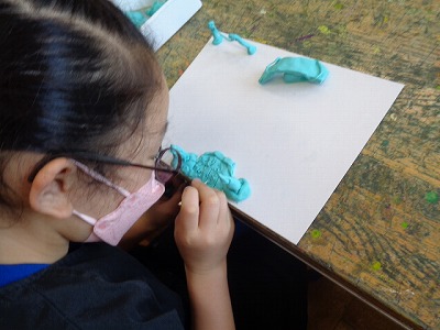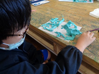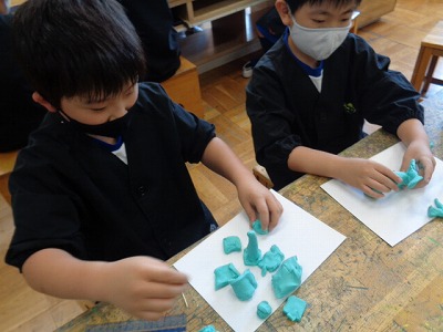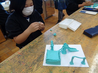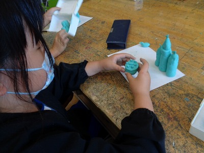 粘土をこねたり、もんだり、伸ばしたり、丸めたりして、想像の町をつくり上げる活動です。
