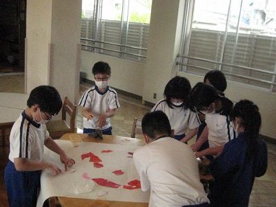 先週作った色を貼り合わせて、大きな太陽を作っています。