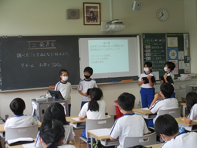 昨日の続きで、「お茶」について調べたことをチーム毎に発表する「ミニ発表会」の時間です。