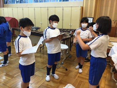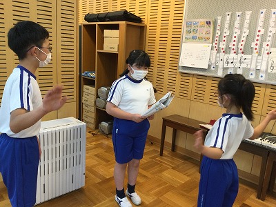 さて、音楽室では、友達の指揮に合わせて歌唱する時間を過ごしました。