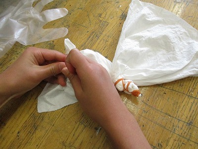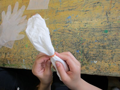 今回はシンプルに輪ゴムを使った「絞り染め」を行いました。