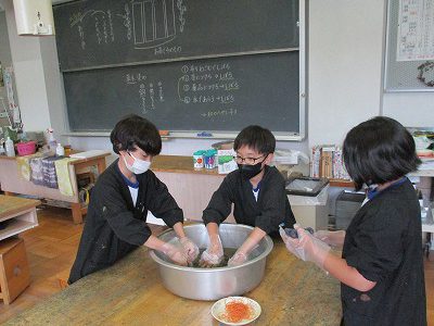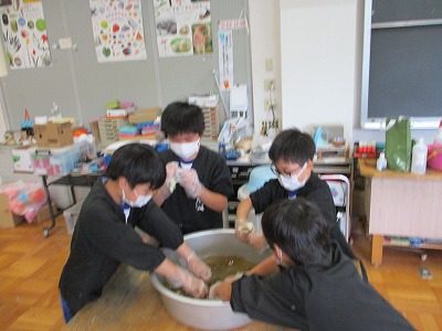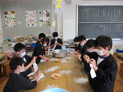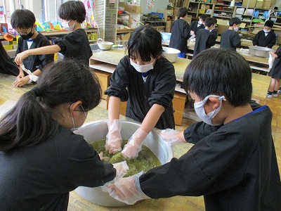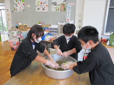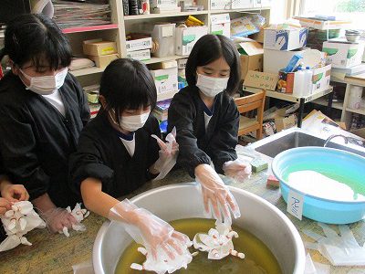 発表テーマの「お茶」に合わせて、図工でも「お茶」を使った染色に挑戦です。