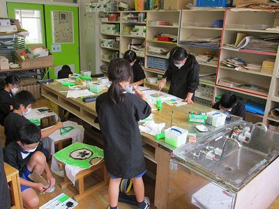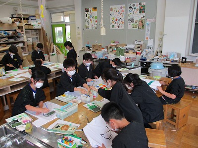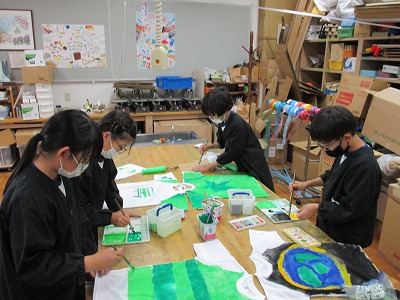 自分で考えたキャラクターを描いたり、チームでワンポイントを揃えたりしながら、布用絵の具やクレパスで描いています。