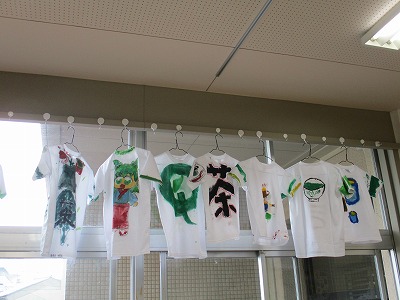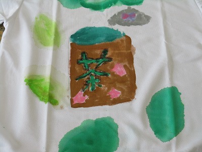 白いTシャツに「お茶」をテーマにした絵や模様を描いています。