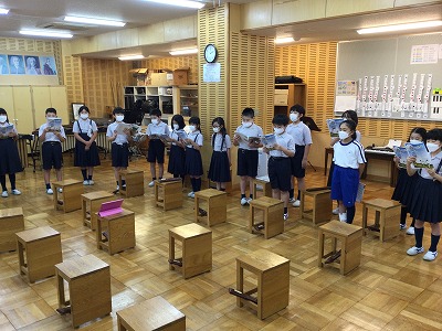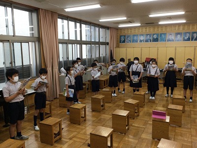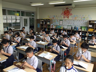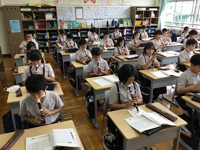 そのあとは、リコーダーの新曲「♪ハローサミング」の階名唱(ドレミで歌うこと)を行い、リズムと休符を確かめる時間を過ごしました。また、エアでのリコーダー練習を念入りに行い、教室へ向かいました。