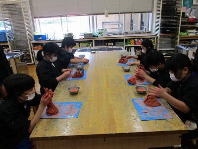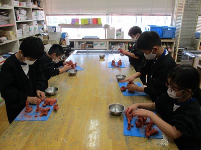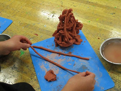 「立ち上がれ!粘土」というテーマで、土粘土の立たせ方や組み合わせ方を工夫して作品を作っています。