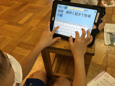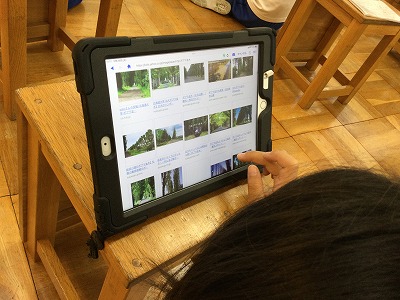タブレットの検索機能とスクリーンショットを使い、写真を貼り付けることや、その画像を選んだ理由とその情景を説明する文章を打ち込む活動です。