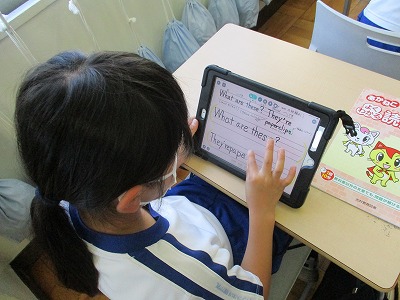 英語の先生の発音を聞いた後、書く練習をしています。