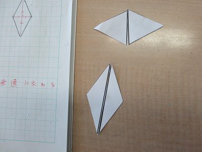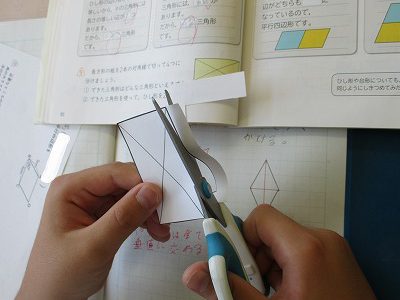 長方形の紙を2本の対角線で切った後、できた三角形を調べたり、ひし形を作ったりしました。