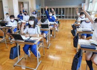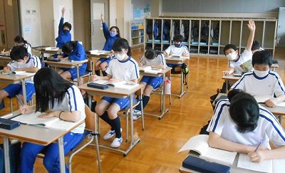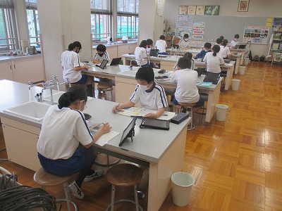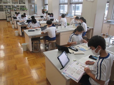 今日は1回目の授業の続きで、教科書の「私たちの生活と環境」のイラスト画をもとに、6年生理科の学習内容全体を見通すことから始めました。
