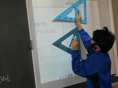 対称になる2つの点を結んだ線と、対称な軸は「垂直」に交わることを意識しながら、三角定規を使って考えました。