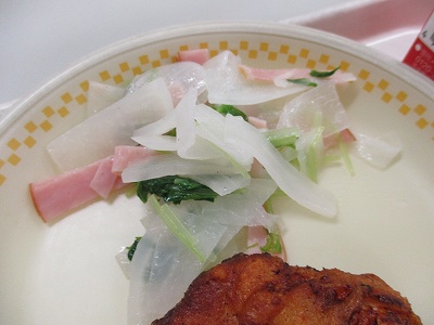 ☆ 水菜のサラダは、食べやすいように2センチ程度の長さにそろえて切ってあります。短く切ると、大根ともよくなじんで食べやすくなりました。京都で古くから栽培されてきたことから「京菜」とも呼ばれ、カロテンやビタミンCを多く含む野菜です。