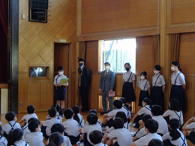 現児童会会長と、新児童会会長が、みんなの前で挨拶や決意を話してくれました。