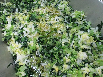 ☆ 白菜と小松菜のおかか和えです。白菜は細い短冊に切って和え物にしました。濃い緑色がきれいな小松菜は、ゆでた後によく水を絞って和え物にするのがポイントです。