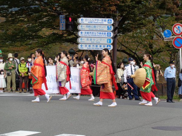 桓武天皇が長岡京から平安京に移した794年10月22日に実施しているそうです。巡行のゴールは、平安神宮で、本校のご近所さまです。