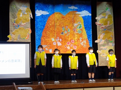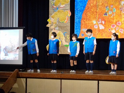 続いて、子どもたちが選んだ民話、「ブレーメンの音楽隊」・「ハリネズミと金貨」・「3匹のクマ」・「ライオンとタカとアリになった男の子」・「石ころのスープ」・「むらの英雄」を紹介してくれました。