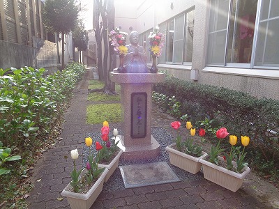 こちらは玄関前です。1年生が植えたチューリップと、勢至丸さまがお出迎えです。