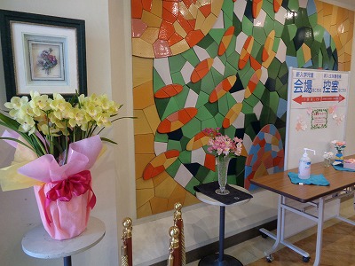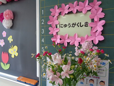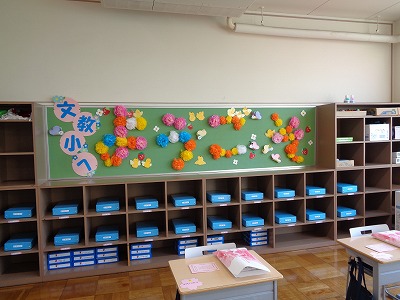 掲示板には「文教小へ」と書いてあります。その横にはお花があります。よく見ると……「ようこそ」の文字になっていました。実は昨日、6年生が作ってくれていたのでした!