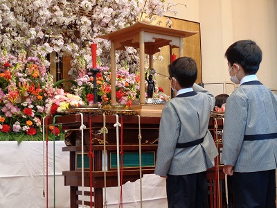 偉大なお二人のご誕生と、ピカピカの1年生の入学をお祝いし、桜の花などで いっぱいの「花まつり」入学式を行いました。