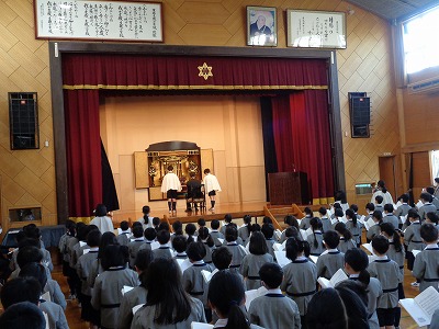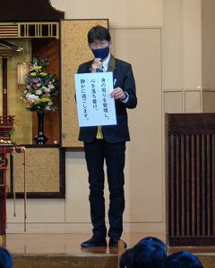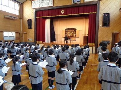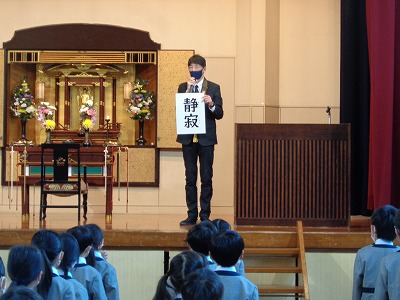 はじめに、教頭先生より法然上人の詠まれた「月かげ」についてお話がありました。「明るく 正しく 仲良く」の学校生活を送ろうと礼拝に臨みます。