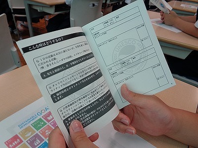 江木先生から「SDGsパスポート」をもらいました。課題発見・調べたこと・実践などについて記録できます。