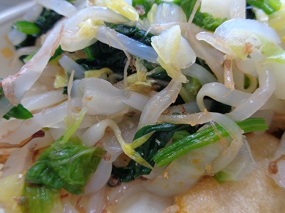 ☆ おかか和えは、ほうれん草、もやし、白菜を合わせました。おかか和えは、かつおぶしで和えた和え物です。野菜にしっかり出汁が染み込むように調理しました。
