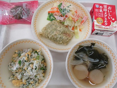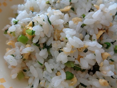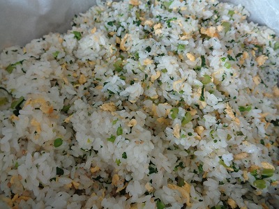 菜の花ご飯は、炒り卵をご飯に混ぜて、緑と黄色で菜の花のような色合いの混ぜご飯にしています。