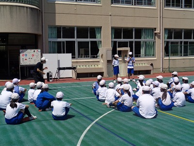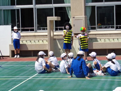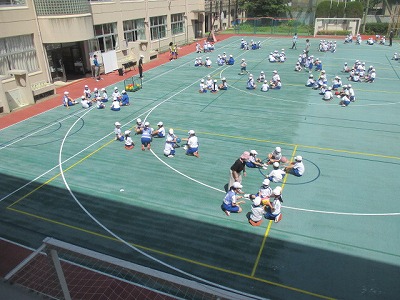 今日の昼休み、全校生が運動場に集まり、縦割りれんげ班活動 第二弾のイベント集会をしました。