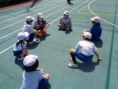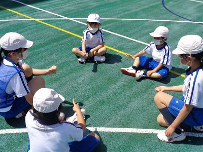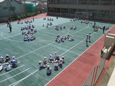 全校生が運動場いっぱいに広がり、それぞれの班が円になりました。