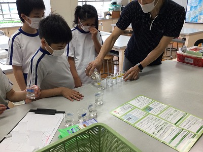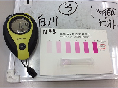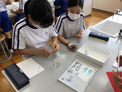 昼休みの理科室で、さっそく「パックテストによる川の水調査セット」を使った水質調査を行いました。