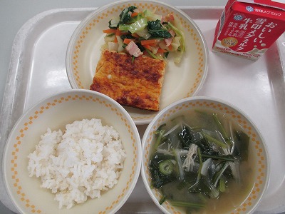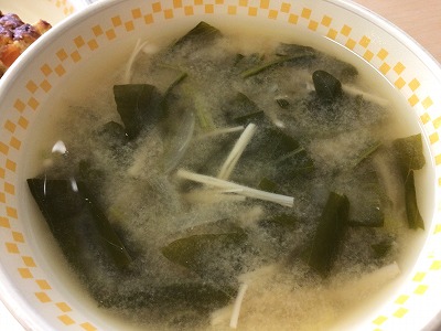 ☆ 壬生菜やえのきの味噌汁です。えのきを味噌汁に入れることで、きのこに含まれる「グアニル酸」といううま味成分がよく出て、さらに味わい深くなりました。
