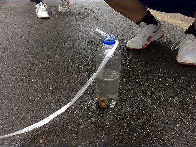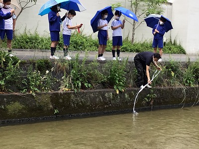 そこで、文教キッズ有志による調査隊が現地に出かける前に、自分たちのそばに流れる「白川」の水質にも目を向けておきたいと考えました。早速、今日の中間休みに、6年生メンバーと理科の岡﨑先生が、水を取りに出かけてくれました。