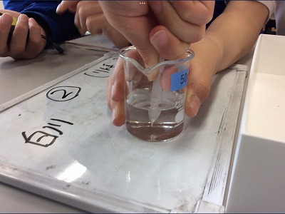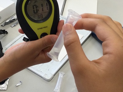 調べる項目によって、2分や3分、5分と色の変化を待つ時間が違います。各テーブルは、調べる項目に分かれています。タイマーやストップウォッチ担当や、記録担当など、役割を決めて実験しました。