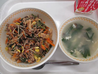 ☆ 今日は韓国料理を再現した献立です。ビビンバは辛くならないよう、キムチの量などを控えめにして味つけしました。野菜がったっぷりのビビンバの具をご飯と一緒においしくいただきました。大豆もやしの黄色が鮮やかなビビンバです。