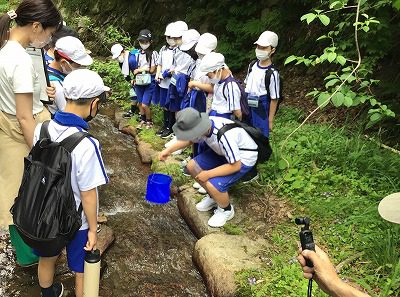 五十河川の上流に着きました。川の様子をじっくり見ました。「生き物は、いるかな?」「冷たい水!」「においは?」「白川・ビオトープとの違いは?」