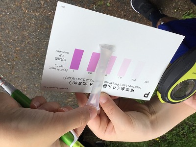 早速、川の水質調査です。すでに白川・ビオトープで経験したことがあるので、手際よく進められました。