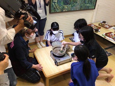 夕食を頂く前に、子ども達が新鮮なワカメをお湯に通して色の変化を観察しました。ここでもミニ実験です。また、そのワカメを「つみれ汁」の具材して下さることになりました。