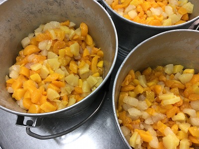 ☆ フルーツカクテルは、黄色やオレンジなど色あいもきれいなデザートです。甘酸っぱいデザートで、少し辛みのあるカレーの後にいただきました。口の中をさっぱり、さわやかにしてくれました。