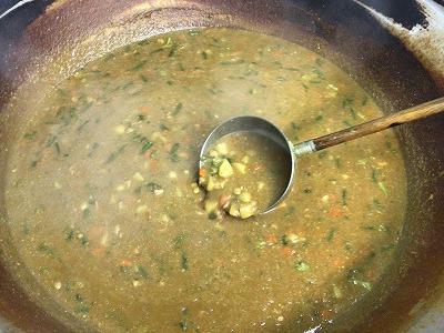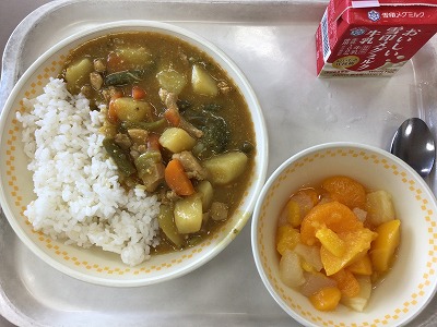☆ チキンカレーは「とりがら」でとったスープと鶏肉のうま味がよく効いたカレーライスになりました。具は食べやすいように、一口大に切って調理しました。みんなでおいしくいただきました。