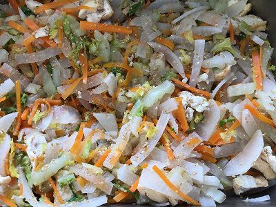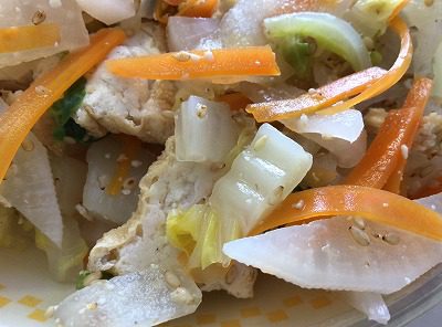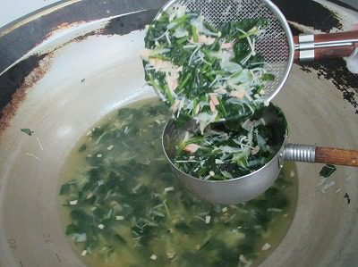 厚揚げは下味をつけるために、先に煮ています。煮ておくことで味がぼやけず、胡麻あえをおいしく食べられます。