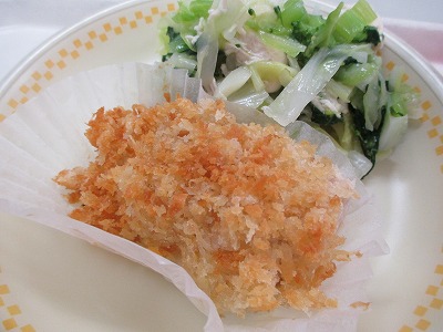 ☆ パン粉焼きは、塩こしょうで下味をつけたさわらに、パン粉をかけてこんがり焼きました。