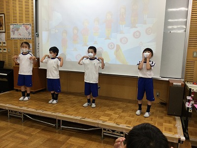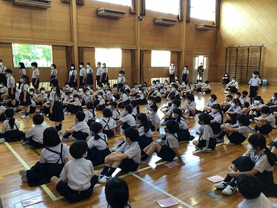 校長先生のお話を聞いた後は、初めての代表交代集会です。新児童会本部と各代表が紹介されました。1年生学級代表さんもドキドキの中、しっかり返事ができました。