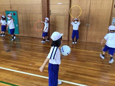 ペアになって、サーブをねらったところにうまく打つ練習をしました。「ここに輪っかを持っててね。」や「よし、入った!交代~!」と上手にペア練習していました。