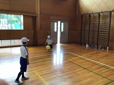 3人グループで、ボールをまわす練習です。バウンドしてもOKのルールで、次の人にボールを高くあげて渡す練習なのですが、上にあげるのがなかなか難しいようでした。